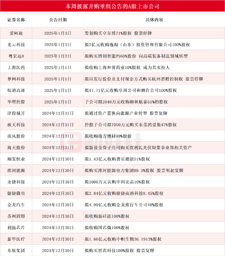据财联社不完全统计,截至发稿,本周披露并购重组进展的A股上市公司共有22家,分别为爱柯迪、光云科技、粤宏远A、上海医药、梦网科技、皖通高速、华塑控股、津投城开、欣天科技、南风股份、海天股份、顺发恒业、淮河能源、麦捷科技、捷捷微电、金龙汽车、苏州固锝、利扬芯片、新华医疗、东软集团、深康佳A和华斯股份。具体情况如下图: