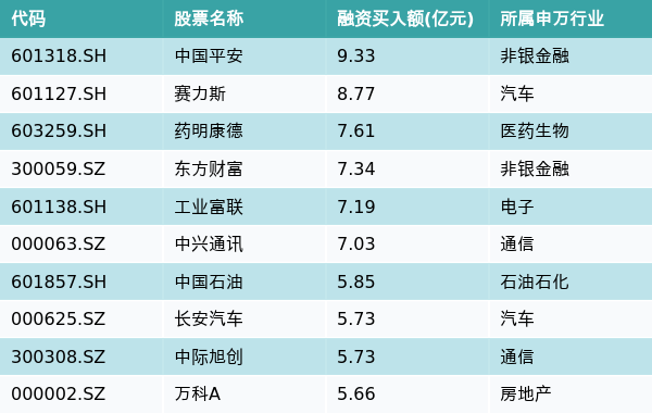 5月6日,两市共有3301只个股有融资资金买入,其中中国平安、赛力斯、药明康德排名前三,买入金额分别9.33亿元、8.77亿元、7.61亿元。融资买入额前10个股详情见下表: