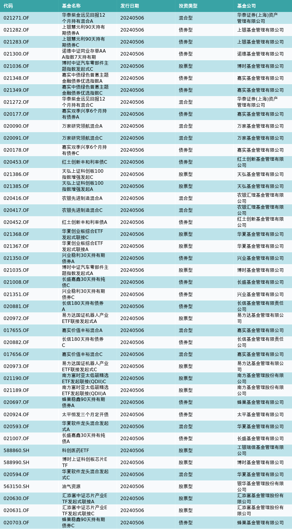 5月6日有43只新基金发行,分别为:华泰紫金远见回报12个月持有混合A、上银慧元利90天持有期债券A、上银慧元利90天持有期债券C、诺德中证同业存单AAA指数7天持有期、博时中证汽车零部件主题指数发起式C、嘉实中债绿色普惠主题金融债券优选指数A、嘉实中债绿色普惠主题金融债券优选指数C、华泰紫金远见回报12个月持有混合C、嘉实双季兴享6个月持有债券A、万家研究领航混合A、万家研究领航混合C、嘉实双季兴享6个月持有债券C、红土创新丰和利率债C、天弘上证科创板100指数增强发起C、天弘上证科创板100指数增强发起A、农银先进制造混合A、农银先进制造混合C、红土创新丰和利率债A、华夏创业板综合ETF发起式联接C、华夏创业板综合ETF发起式联接A、兴业稳利30天持有期债券A、博时中证汽车零部件主题指数发起式A、长盛嘉鑫30天持有纯债C、兴业稳利30天持有期债券C、长信180天持有债券A、易方达国证机器人产业ETF联接发起式A、嘉实价值丰裕混合A、长信180天持有债券C、嘉实价值丰裕混合C、易方达国证机器人产业ETF联接发起式C、南方富时亚太低碳精选ETF发起联接(QDII)C、南方富时亚太低碳精选ETF发起联接(QDII)A、蜂巢稳鑫90天持有期债券A、太平恒发三个月定开债、华夏软件龙头混合发起式A、长盛嘉鑫30天持有纯债A、科创医药ETF、博时上证科创板芯片ETF、华夏软件龙头混合发起式C、油气资源、汇添富中证芯片产业ETF发起式联接A、汇添富中证芯片产业ETF发起式联接C、蜂巢稳鑫90天持有期债券C,详情见下表: